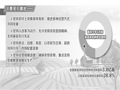 土地流轉(zhuǎn)和適度規(guī)模經(jīng)營(yíng)是發(fā)展現(xiàn)代農(nóng)業(yè)的必由之路。11月20日,《關(guān)于引導(dǎo)農(nóng)村土地經(jīng)營(yíng)權(quán)有序流轉(zhuǎn)發(fā)展農(nóng)業(yè)適度規(guī)模經(jīng)營(yíng)的意見(jiàn)》公布?!兑庖?jiàn)》傳遞出以經(jīng)營(yíng)規(guī)模適度為目標(biāo)促進(jìn)糧食增產(chǎn)與農(nóng)民增收、以農(nóng)戶家庭經(jīng)營(yíng)為基礎(chǔ)積極培育新型農(nóng)業(yè)經(jīng)營(yíng)主體、以尊重農(nóng)民意愿為前提引導(dǎo)土地規(guī)范有序流轉(zhuǎn)的改革思路。