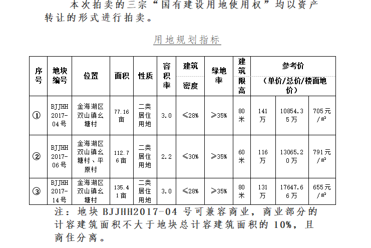 1、規(guī)劃:①號(hào)地塊77.16畝,容積率3.0,起拍價(jià)141萬(wàn)元/畝;②號(hào)地塊112.76畝,容積率2.2,,起拍價(jià)116萬(wàn)元/畝;③號(hào)地塊135.41畝,容積率3.0,起拍價(jià)131萬(wàn)元/畝;成交之日起三個(gè)月內(nèi)支付成交款80%,余款六個(gè)月內(nèi)付清。