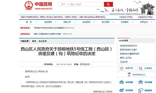 《昆明市西山區(qū)人民政府關(guān)于昆明地鐵5號線工程(西山段)房屋及建(構(gòu))筑物征收的決定》已經(jīng)區(qū)人民政府研究通過,現(xiàn)予公布,自公布之日起施行。